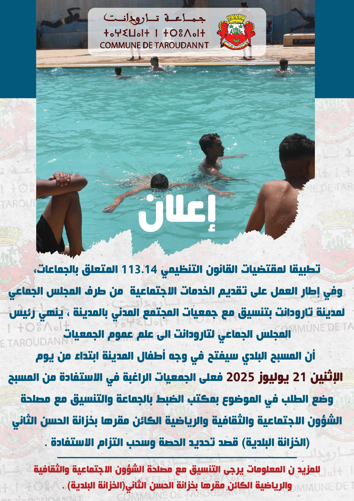 للمزيد من المعلومات يرجى التنسيق مع مصلحة الشؤون الاجتماعية و الثقافية و الرياضية الكائن مقرها بخزانة الحسن الثاني (الخزانة البلدية).