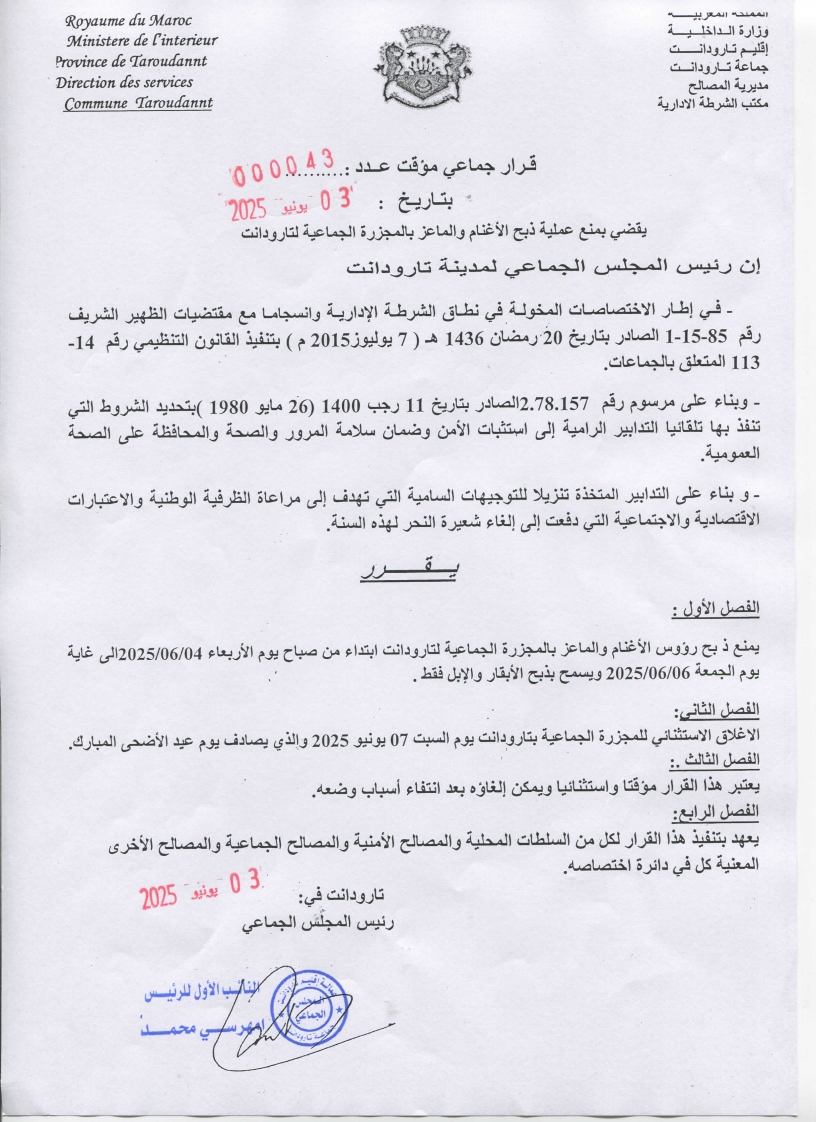 يقضي بمنع عملية ذبح الأغنام والماعز بالمجزرة الجماعية لتارودانت