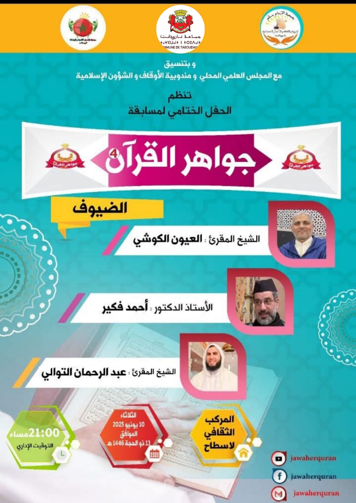 بشراكة مع جماعة تارودانت و بتنسيق مع المجلس العلمي المحلي و مندوبية الاوقاف و الشؤون الاسلامية ينظم الحفل الختامي لمسابقة جواهر القرآن في نسخته الرابعة بتاريخ الثلاثاء 10يونيو 2025 بالمركز الثقافي بتارودانت.