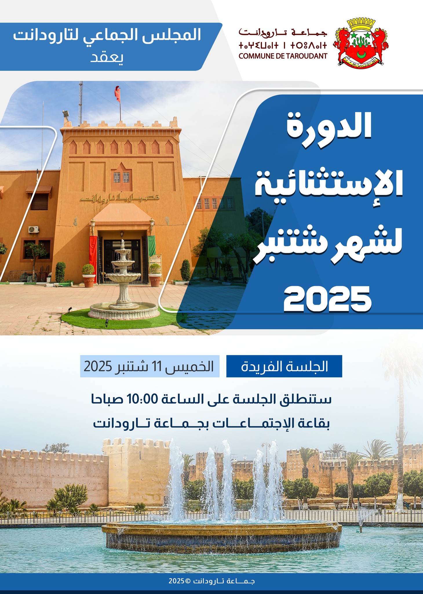 جدول أعمال الدورة الإستثنائية لشهر ستنبر 2025 الجلسة الفريدة، الخميس 11 شتنبر 2025 على الساعة 10 صباحا بقاعة الإجتماعات بجماعة تارودانت.
