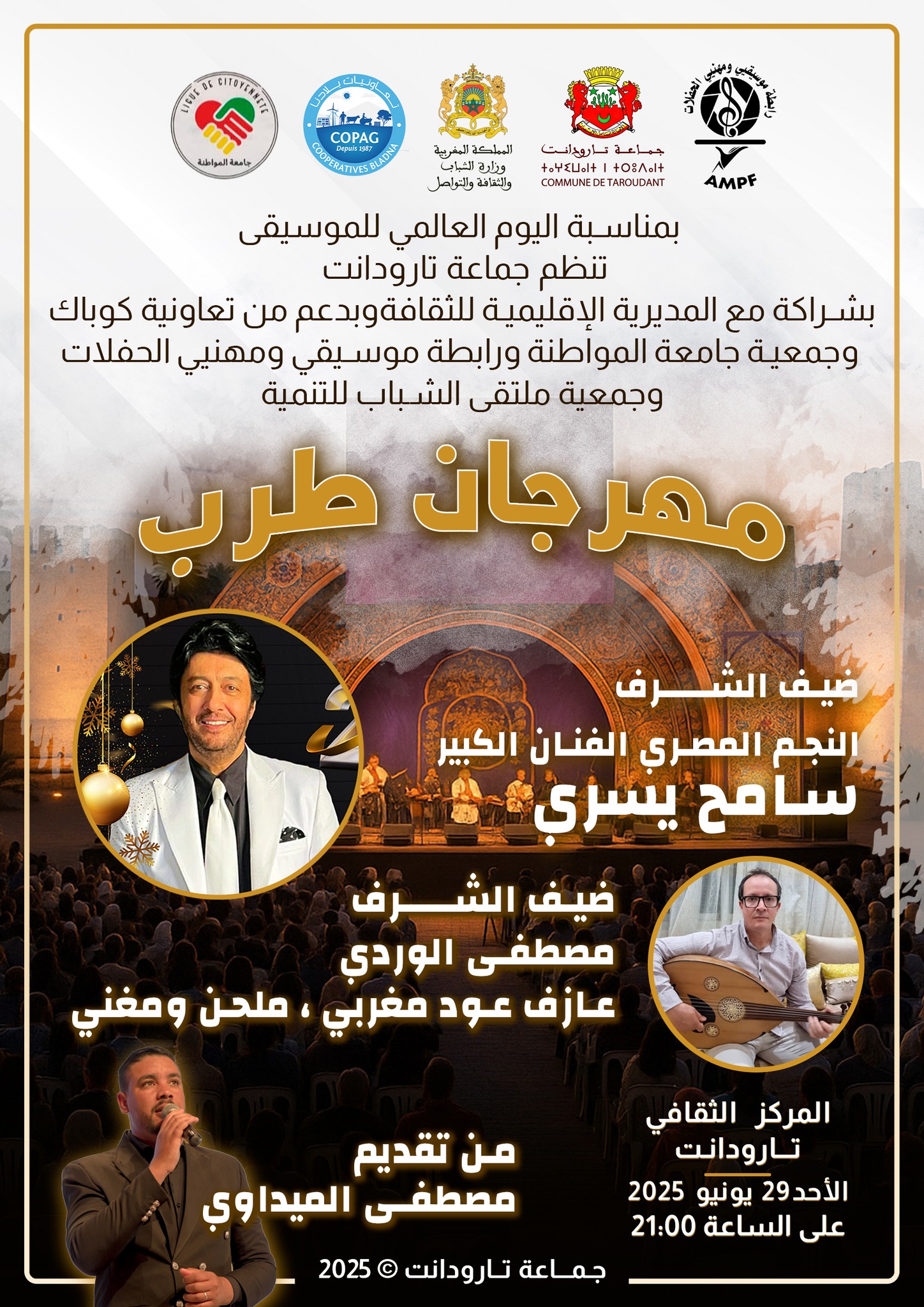 بمناسبة اليوم العالمي للموسيقى، تنظم جماعة تارودانت بشراكة مع المديرية الاقليمية للثقافة امسية فنية بالمركز الثقافي لسطاح تارودانت و ذلك يوم الاحد 29 يونيو 2025